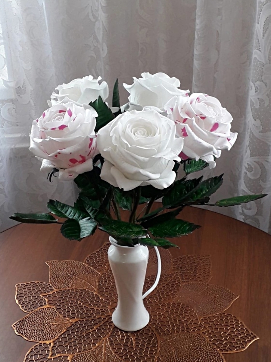 Зефирный фоамиран мягкий, податливый, с низкой плотностью и очень эластичный. Имеет свойство немного «стягивается» обратно, учитывайте это при растягивании. Его особенность — высокая тягучесть. Не нужно дополнительно обрабатывать теплом, чтобы получить желаемый эффект, что дает возможность легко достичь полупрозрачности лепестков для нежнейших бутонов. Хорошо тонируется, идеально держит форму.