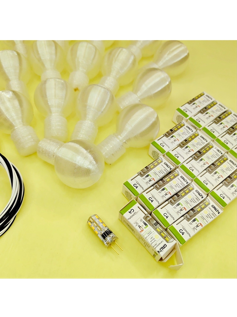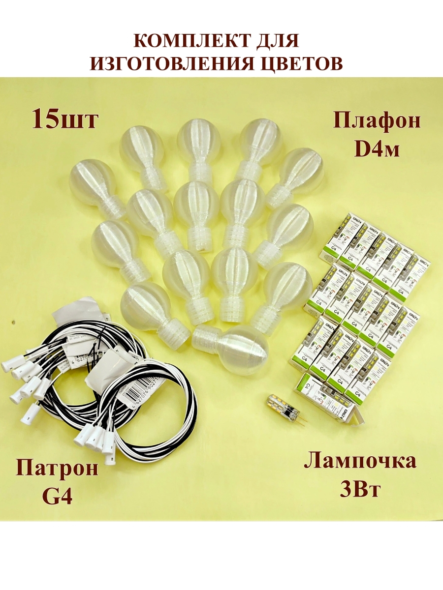 Комплект для создания светильников и цветов - это набор, состоящий из плафона, патрона G4 и лампочки G4. Диаметр плафона составляет 4 см, что позволяет создать светильник или цветок с небольшим объемом и размером.