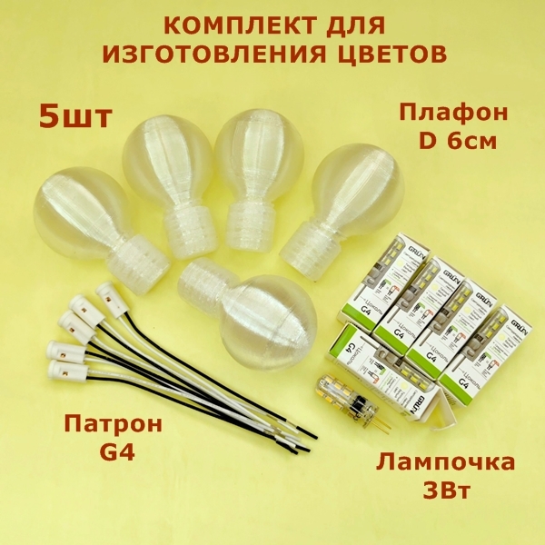 Комплект для создания светильников и цветов - это набор, состоящий из плафона, патрона G4 и лампочки G4. Диаметр плафона составляет 4 см, что позволяет создать светильник или цветок с небольшим объемом и размером.
