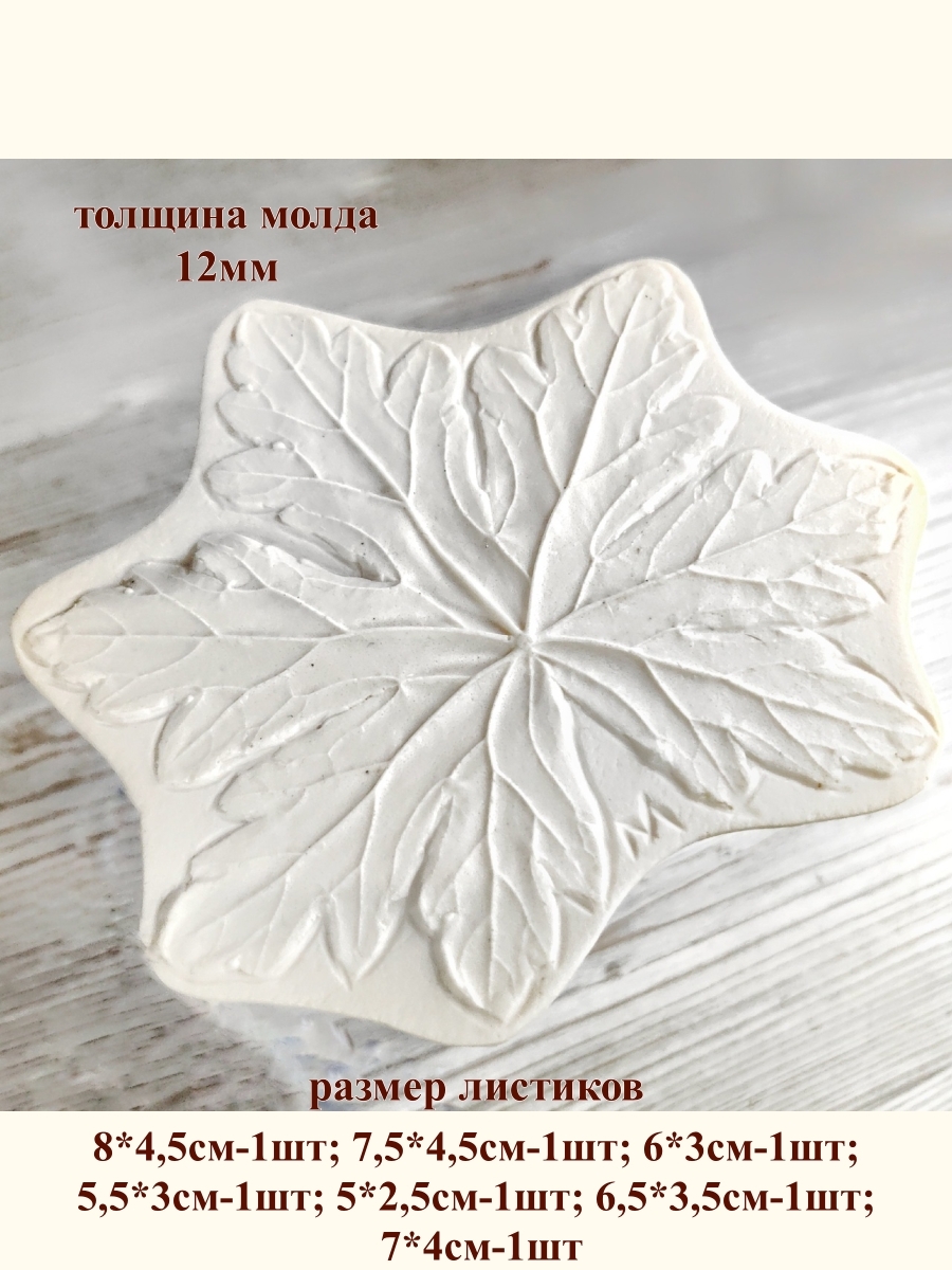 Молды для цветов из изолона и фоамирана используется для придания формы и фактуры листьям и лепесткам. После применения фактурного молда, листва становится максимально похожа на живую. Молд изготовлен из прочного полиуретана, не ломается. Вайнер изготовлен из пищевого силикона. Подходят для многократного использования. Чтобы на фоамиране или изолоне получился четкий отпечаток, его необходимо предварительно нагреть с помощью фена или утюга. Наличие пористости не является браком, так как не нарушает фактуры отпечатка на фоамиране и изолоне. Молды для творчества можно применять при рукоделии цветов и листьев розы ириса лилии тюльпана пиона гортензии ромашки пиона георгина чашелистика эпоксидной смолы свечей мыла шоколада. Размер: молд 14х13см. толщина 12мм. Размер листиков: 8х4,5см-1шт; 7,5х4,5см-1шт; 6х3см-1шт; 5,5х3см-1шт; 5х2,5см-1шт; 6,5х3,5см-1шт; 7х4см-1шт