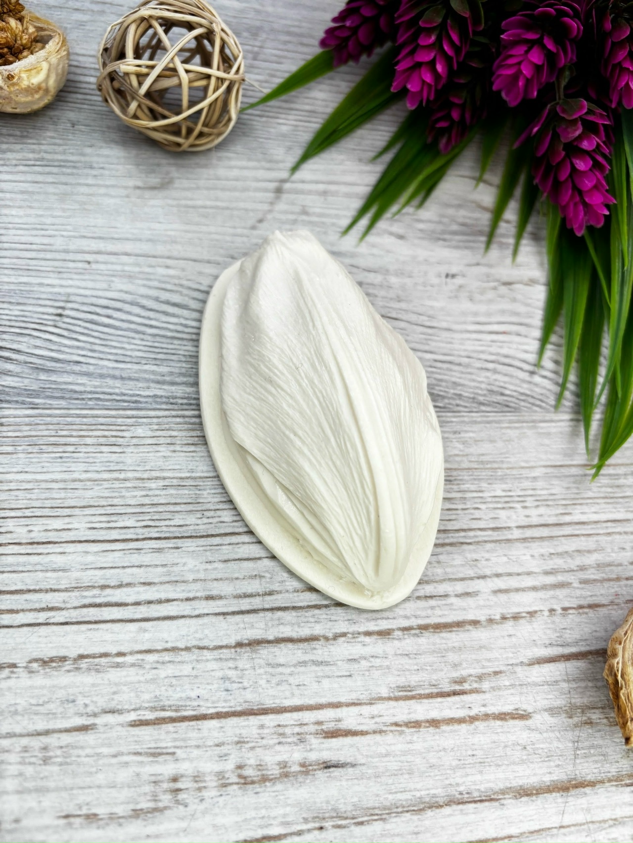 Молд+вайнер лепесток тюльпана: Часть А (в пластике): 9,4х5,2см, Обратная часть – часть Б (в силиконе): 10х6,3 см.