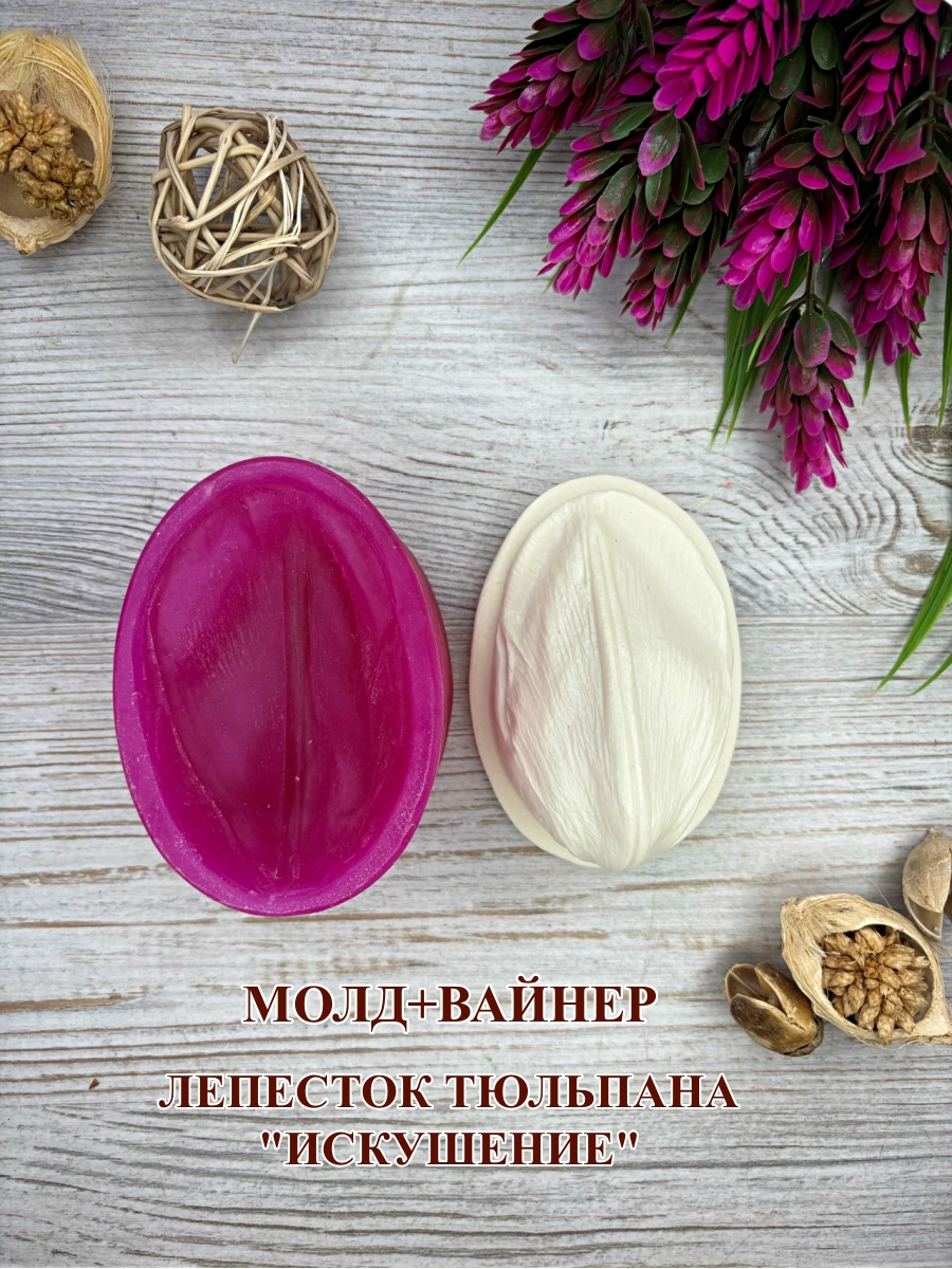 Молд+вайнер лепесток тюльпана: Часть А (в пластике): 8,6х5,3см, Обратная часть – часть Б (в силиконе): 9,3х7,0 см.