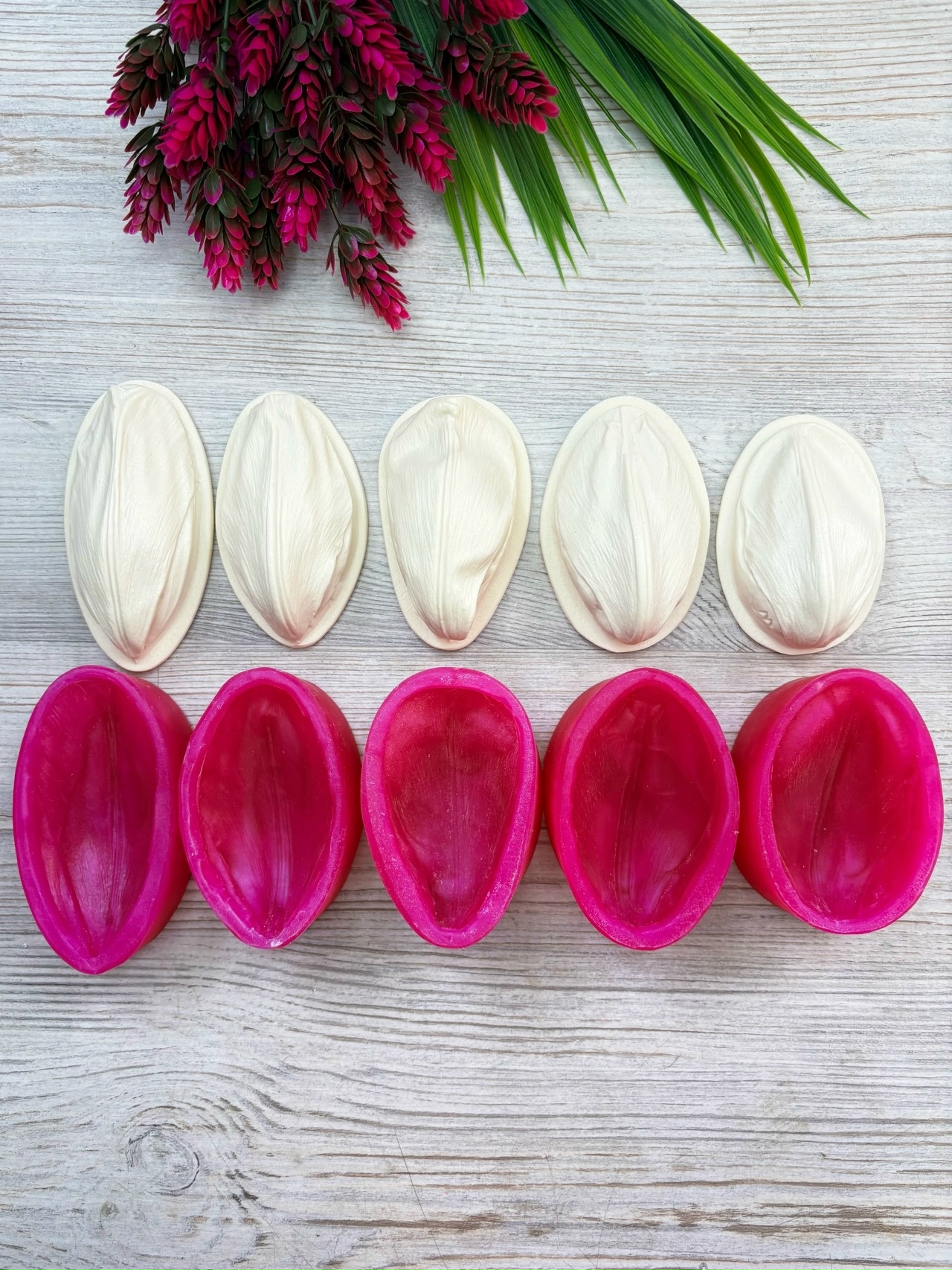 Набор состоит из 5-ти комплектов: 1. Молд+вайнер лепесток тюльпана: Часть А (в пластике): 9,2х5,1 см, Обратная часть – часть Б (в силиконе): 9,8х7,0 см. 2. Молд+вайнер лепесток тюльпана: Часть А (в пластике): 8,6х5,3 см, Обратная часть – часть Б (в силиконе): 9,3х7,0 см. 3. Молд+вайнер лепесток тюльпана: Часть А (в пластике): 9,1х5,4 см, Обратная часть – часть Б (в силиконе): 9,9х6,9 см. 4. Молд+вайнер лепесток тюльпана: Часть А (в пластике): 10,5х5 см, Обратная часть – часть Б (в силиконе): 11,2х6,5 см. 5. Молд+вайнер лепесток тюльпана: Часть А (в пластике): 9,4х5,2 см, Обратная часть – часть Б (в силиконе): 10,0х6,3 см.