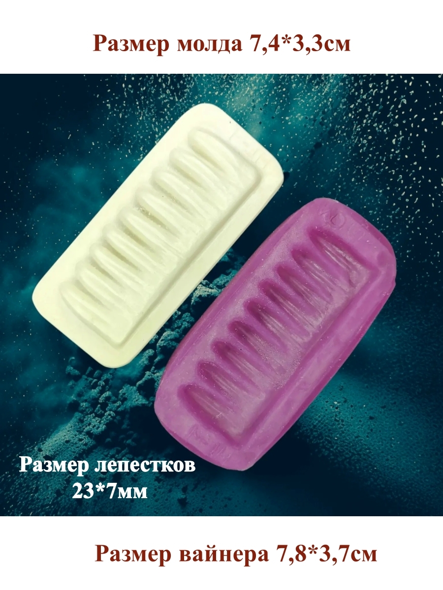 Авторский вайнер МГ-1: Часть А (в пластике): 7,4х3,3 см, Обратная часть – часть Б (в силиконе): 7,8х3,7 см. Размер лепестков: 23х7мм.