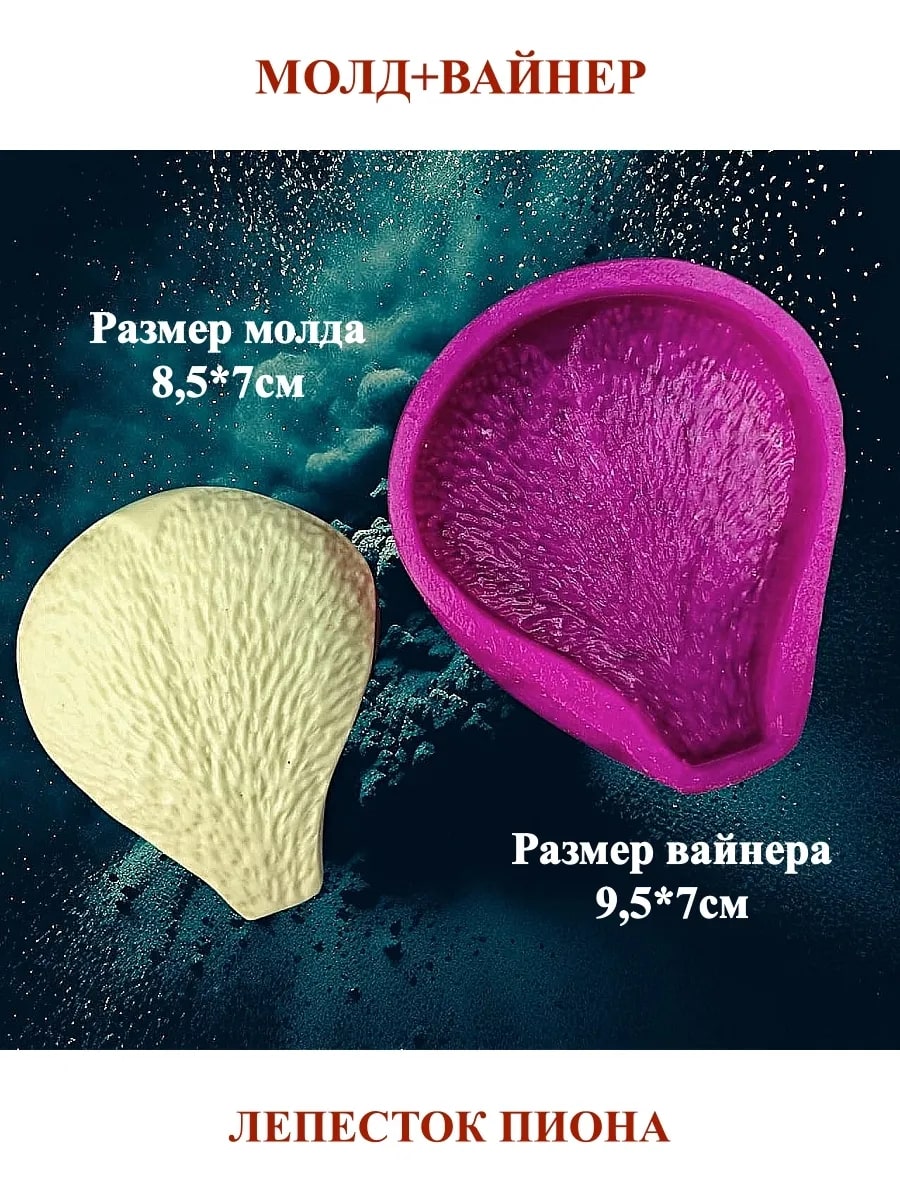 Комплект авторских вайнеров состоит из шести частей. Часть А (в пластике) состоит из 3-ех молдов: НП-1: 4,0х2,5см, НП-2: 4,5х2,3, НП-3: 5,7х2,8см. Обратная часть – часть Б (в силиконе): 8х9 см. НП-4: Часть А (в пластике): 7х4,8 см, Обратная часть – часть Б (в силиконе): 8х6,5 см. НП-5: Часть А (в пластике): 7,5х5,5 см, Обратная часть – часть Б (в силиконе): 8х6,5 см. НП-6: Часть А (в пластике): 7,6х4 см, Обратная часть – часть Б (в силиконе): 8,6х6,2 см. НП-7: Часть А (в пластике): 7,5х5 см, Обратная часть – часть Б (в силиконе): 9,5х6,5 см. НП-8 Часть А (в пластике): 8,5х7 см, Обратная часть – часть Б (в силиконе): 9,5х8 см.