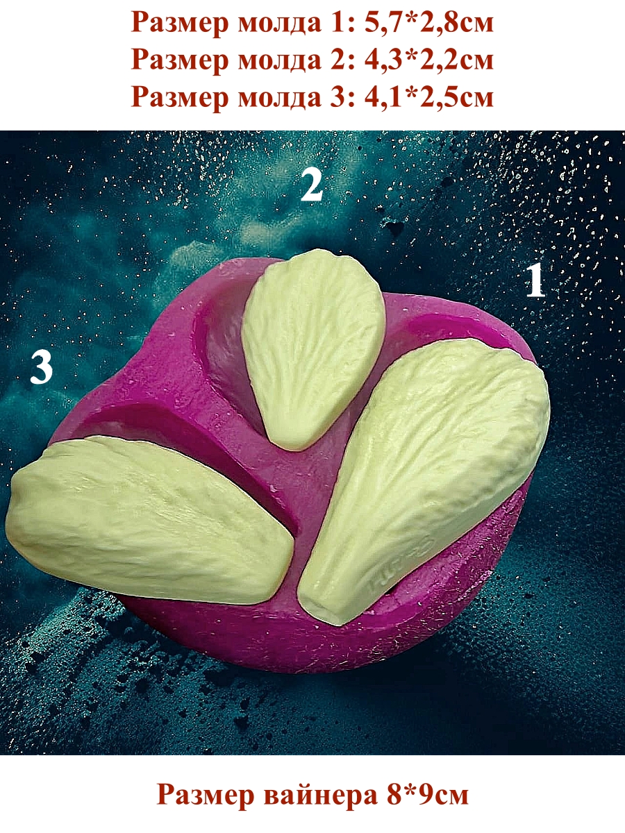 Комплект авторских вайнеров состоит из шести частей. Часть А (в пластике) состоит из 3-ех молдов: НП-1: 4,0х2,5см, НП-2: 4,5х2,3, НП-3: 5,7х2,8см. Обратная часть – часть Б (в силиконе): 8х9 см. НП-4: Часть А (в пластике): 7х4,8 см, Обратная часть – часть Б (в силиконе): 8х6,5 см. НП-5: Часть А (в пластике): 7,5х5,5 см, Обратная часть – часть Б (в силиконе): 8х6,5 см. НП-6: Часть А (в пластике): 7,6х4 см, Обратная часть – часть Б (в силиконе): 8,6х6,2 см. НП-7: Часть А (в пластике): 7,5х5 см, Обратная часть – часть Б (в силиконе): 9,5х6,5 см. НП-8 Часть А (в пластике): 8,5х7 см, Обратная часть – часть Б (в силиконе): 9,5х8 см. Авторский дизайн. Создан Максимовой Д.В «MD-mold» Свидетельство № 023-014870 от 10 мая 2023 г.