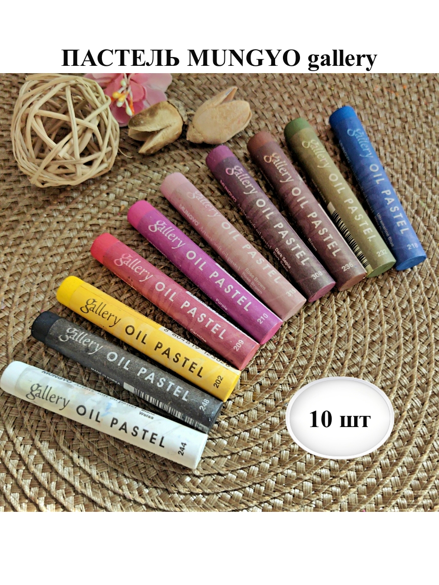 В комплект входит 10 мелков по одному цвету: №202 желтый, №209 кармина, №210 пурпурный, №218 ультрамарин синий, №232 болотный зеленый, №236 коричневый, №244 белый, №248 чёрный, №308 тёмная сепия, №315 розово-коричневый.