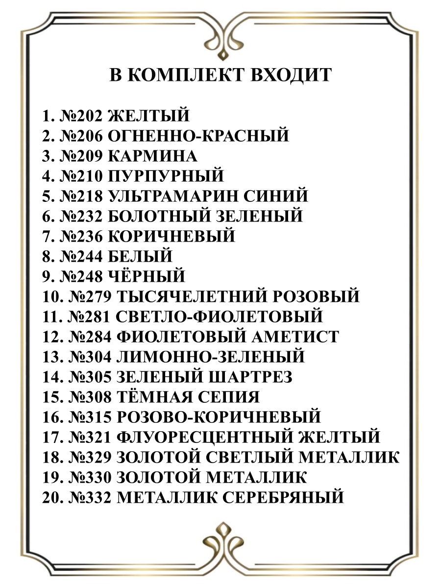 В комплект входит 20 мелков по одному цвету: №202 желтый, №206 огненно-красный, №209 кармина, №210 пурпурный, №218 ультрамарин синий, №236 коричневый, №244 белый, №248 чёрный, №279 тысячелетний розовый, №281 светло-фиолетовый, №284 фиолетовый аметист, №304 лимонно-зеленый, №305 зеленый шартрез, №308 тёмная сепия, №315 розово-коричневый, №321 флуоресцентный желтый, №329 золотой светлый металлик, №330 золотой металлик, №332 металлик серебряный.