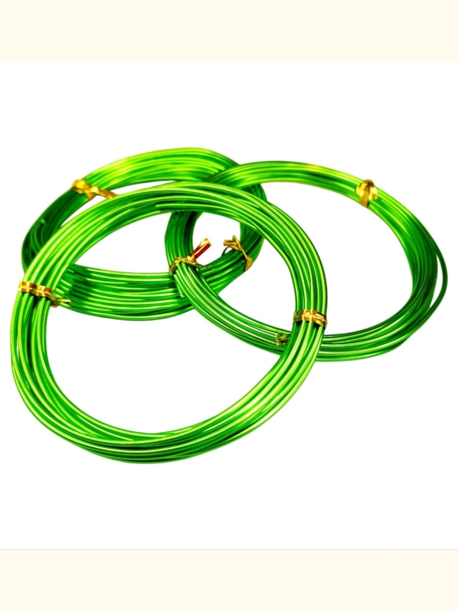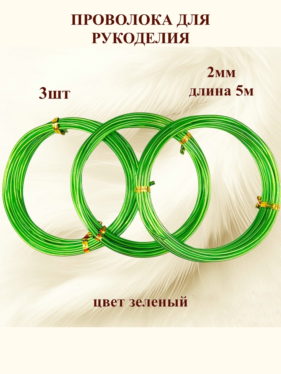 Проволока для рукоделия используется при создании элементов декора, которые должны хорошо держать форму. Ее изготавливают из разных металлов и покрывают лаками разных цветов. Является достаточно популярным вспомогательным материалом во флористике и дизайн-интерьере. Красивые цветочные композиции, искусственные цветы, разнообразные панно, топиарии, декоративные деревья, венки, гирлянды и другие интерьерные и сувенирные изделия часто создают на основе флористической проволоки. Она бывает разного размера, длины, формы и цвета, отличается высокой гибкостью и прочностью, а также обеспечивает необходимую жесткость создаваемым конструкциям. Чтобы изготовить листья и стебли растений и цветов-необходима флористическая проволока. Гибкий и тонкий материал позволяет укрепить ветки, сделать их более длинными, обеспечив при этом необходимую жесткость конструкции. Он легко принимает заданную форму, хорошо гнется и позволяет надежно зафиксировать в необходимом положении отдельные элементы цветочной композиции. Использовать флористическую проволоку легко и просто. С этим справится даже начинающий мастер. Для создания устойчивого каркаса стержень можно вставить непосредственно в стебель растения (искусственного или живого). Для закрепления на пруте цветка или бутона, его основание можно дополнительно обмотать нитью. При создании цветов из бисера, бусинки нанизывают на тонкую металлическую нить, придавая декору в процессе плетения нужную форму. В комплект входит: проволока диаметром 2мм, длиной 5м, цвет зеленый-3шт