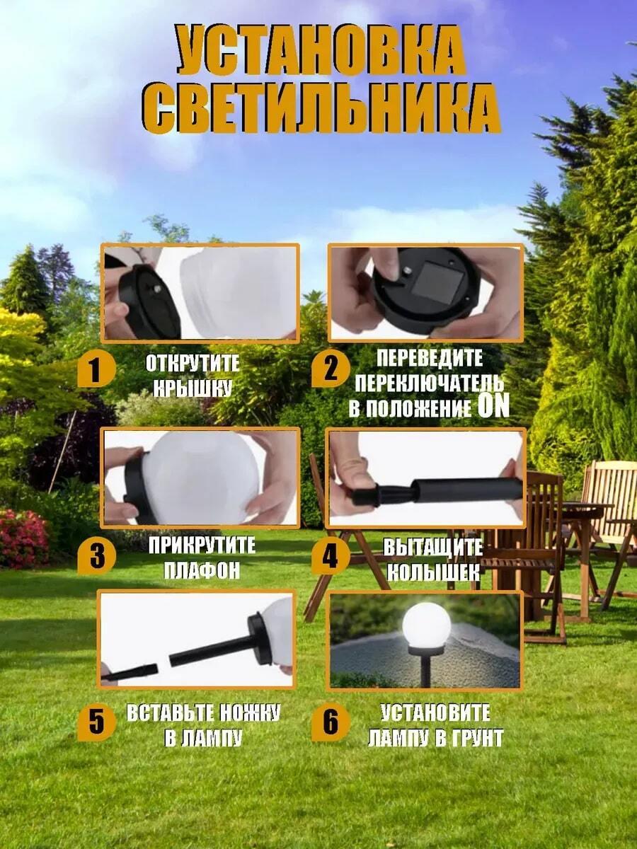 Фонарики уличные на солнечной батарее - запоминающееся и впечатляющее украшение любого дачного участка, сада, огорода, а также территории вокруг дома. Эти фонарики не требует подзарядки, т.к имеет внутренние солнечные батарейки, он автоматически включается при наступлении сумерек и выключается при восходе солнца, ведь в него встроен датчик света. Светильник садовый используется для украшения огромного количества зон: газона, клумб, кемпинга, палаток, летних домиков, садовой мебели, бассейнов, придомовых дорожек, прудиков. Время работы фонарика от заряда солнечной батарейки - 6-12 часов. Ландшафтный светильник станет прекрасным украшение к таким праздникам, как день рождения, юбилей, новоселье, в том числе оригинальным подарком. Светодиодный фонарик можно использовать вместо садовой гирлянды, для подсветки газона, как украшение сада, освещение для праздника. Отсутствие проводов, беспроводной, делает садовый светильник простым в установке на колышки, мобильным в перемещении. Светильник садовый не боится дождя!Внимание!!! Перед первым использованием необходимо зарядить аккумулятор, для этого разместите солнечную батарею (в состоянии ON) и зарядите ее в течении 2 солнечных дней (это увеличит срок службы светильника), не включая на ночь. Если дни были пасмурными, то увеличьте процесс зарядки до 3-4 дней. Затем включите кнопку ON, огоньки светильника будут сами включаться и выключаться в зависимости от заката и рассвета. Светильники уличные безопасны для детей, животных.Перед упаковкой каждый наш уличный светильник проходит проверку на исправность!А также для безопасной транспортировки фонарик светодиодный упакован в картонный короб.